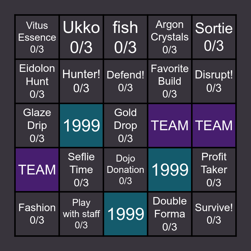 This bingo card has 25 words: Seflie Time 0/3, 1999, Defend! 0/3, Fashion 0/3, Sortie 0/3, Vitus Essence 0/3, Eidolon Hunt 0/3, Ukko 0/3, TEAM, Dojo Donation 0/3, Favorite Build 0/3, Glaze Drip 0/3, 1999, Profit Taker 0/3, Hunter! 0/3, Survive! 0/3, TEAM, fish 0/3, Disrupt! 0/3, 1999, Gold Drop 0/3, Play with staff 0/3, TEAM, Argon Crystals 0/3 and Double Forma 0/3.