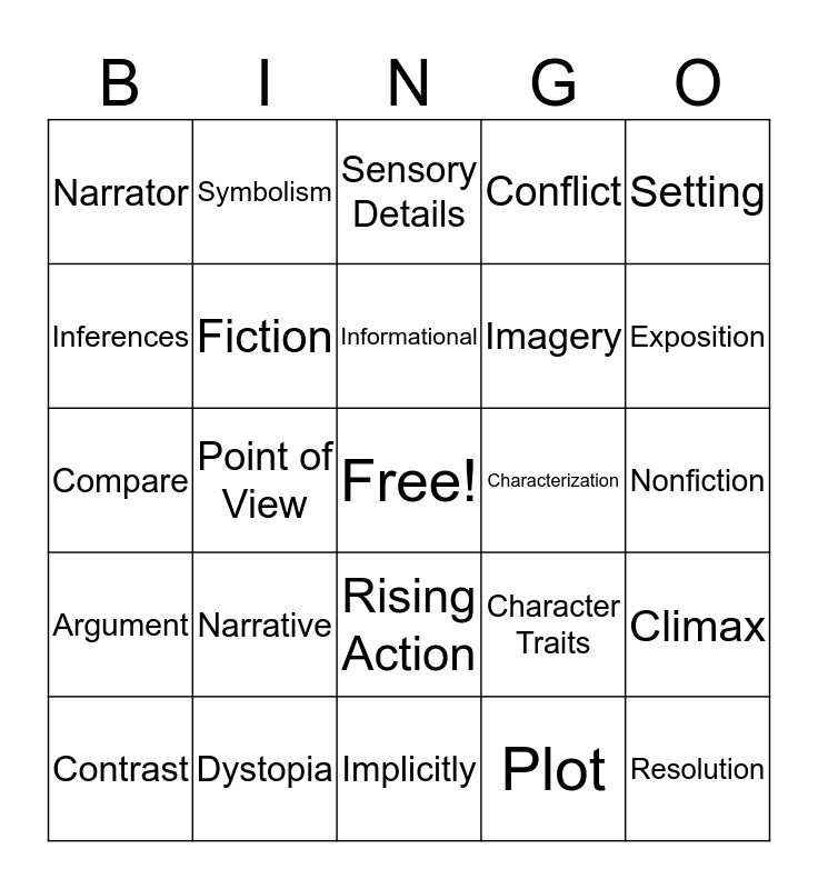 This bingo card has a free space and 27 words: Character Traits, Explicitly, Imagery, Implicitly, Inferences, Sensory Details, Symbolism, Argument, Characterization, Climax, Compare, Conflict, Contrast, Dystopia, Exposition, Falling Action, Fiction, Informational, Narrative, Narrator, Nonfiction, Plot, Point of View, Resolution, Rising Action, Setting and Utopia.