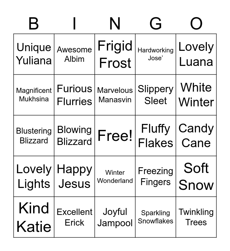 This bingo card has a free space and 24 words: Happy Jesus, Excellent Erick, Marvelous Manasvin, Kind Katie, Lovely Luana, Unique Yuliana, Magnificent Mukhsina, Awesome Albim, Fluffy Flakes, Winter Wonderland, Slippery Sleet, Blustering Blizzard, Freezing Fingers, Soft Snow, Furious Flurries, Sparkling Snowflakes, Candy Cane, Frigid Frost, White Winter, Blowing Blizzard, Twinkling Trees, Lovely Lights, Hardworking Jose’ and Joyful Jampool.