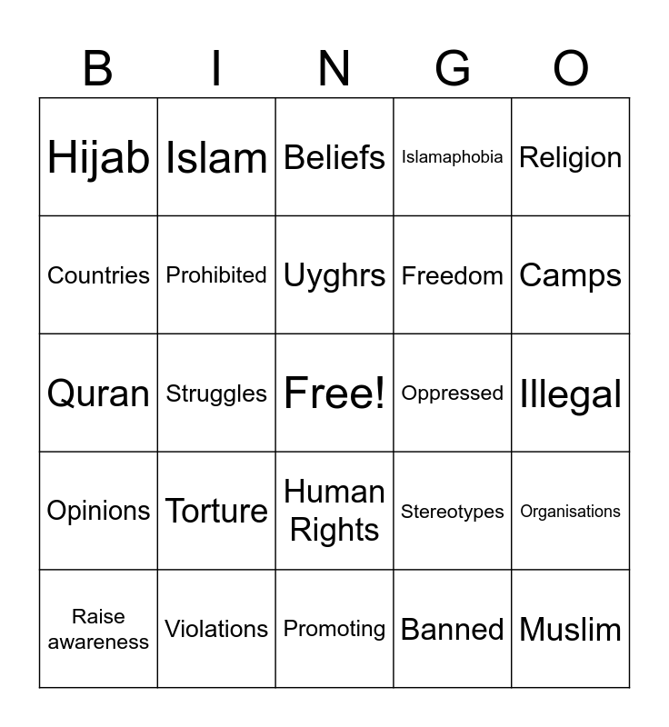 This bingo card has a free space and 26 words: Human Rights, Banned, Uyghrs, Violations, Religion, Hijab, Countries, Islam, Illegal, Stereotypes, Freedom, Quran, Organisations, Raise awareness, Struggles, Discrimination, Islamaphobia, Opinions, Beliefs, Muslim, Camps, Promoting, Oppressed, Torture, Prohibited and Genocide.