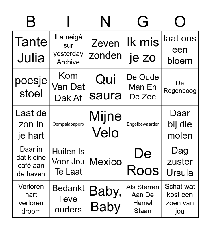 This bingo card has 75 words: Zwarte Lola, Zo mooi zo blond en zo alleen, Zeven zonden, Westenwind, waar en wanneer, Vlaanderen Boven, Verlaat me nooit, Van 'S Morgens Tot 'S Avonds, t is moeilijk bescgeiden te blijven, Sympathie Is Geen Liefde, Schat wat kost een zoen van jou, rode rozen in de sneeuw, Qui saura, poesje stoei, Oerend hard, Oempalapapero, Mooi Zijn Alle Vrouwen, Mijne Velo, Louise, laat ons een bloem, Laat Het Gras Maar Groeien, Laat de zon in je hart, Kom Van Dat Dak Af, Il a neigé sur yesterday Archive, Ik mis je zo, Iemand heeft je pijn gedaan, het kan niet zijn, heb je even voor mij., Goeiemorgen, morgen, Gelukkig zijn, een beetje verliefd, Een Aperolletje, De Vlieger, De Roos, De Regenboog, De Oude Man En De Zee, dag vreemde man, daar gaat ze, Daar bij die molen, Als Sterren Aan De Hemel Staan, Als Je Alles Weet, als een kus naar tranen smaakt, Aan mijn darling, Zomersproetjes, zeven anjers zeven rozen, Wat heb je vandaag op school geleerd, Verloren hart verloren droom, Tante Julia, Rozen voor Sandra, Oh Heideroosje, Mia, Mexico, Met De Vlam In De Pijp, malle babbe, Lat mie mor lopen, Je Hebt Me 1000 Maal Belogen, ik wil deze nacht in de straten verdwalen, ik verscheurde je foto, Ik ben verliefd op jou, Ieder Mens, Huilen Is Voor Jou Te Laat, Het Werd Zomer, geen wonder dat ik ween, Geef Mij Je Angst, Eviva España, Engelbewaarder, drink rode wijn, De wilde boerendochter, De dag dat het zonlicht niet meer scheen, Dag zuster Ursula, Daar in dat kleine café aan de haven, Bedankt lieve ouders, banger hart, Baby, Baby and Als de dag van toen.