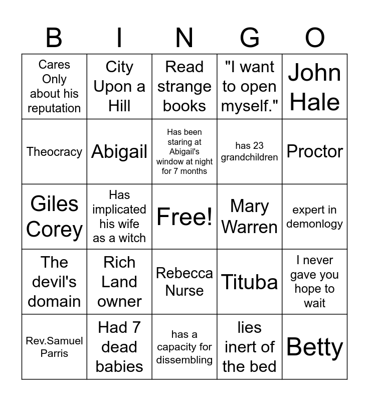 This bingo card has a free space and 29 words: Rev.Samuel Parris, Starts the mass Hysteria, Has implicated his wife as a witch, Tituba, Cares Only about his reputation, Read strange books, Abigail, Rich Land owner, Mary Warren, Had 7 dead babies, expert in demonlogy, Betty, has a capacity for dissembling, lies inert of the bed, Proctor, was caught dancing naked in the forest, Rebecca Nurse, The devil's domain, John Hale, Giles Corey, Tituba, Asks leading questions that force others to make false confessions, has 23 grandchildren, Theocracy, "I want to open myself.", City Upon a Hill, I never gave you hope to wait, Has been staring at Abigail's window at night for 7 months and Witchcraft is a hangin error like they done in Boston.