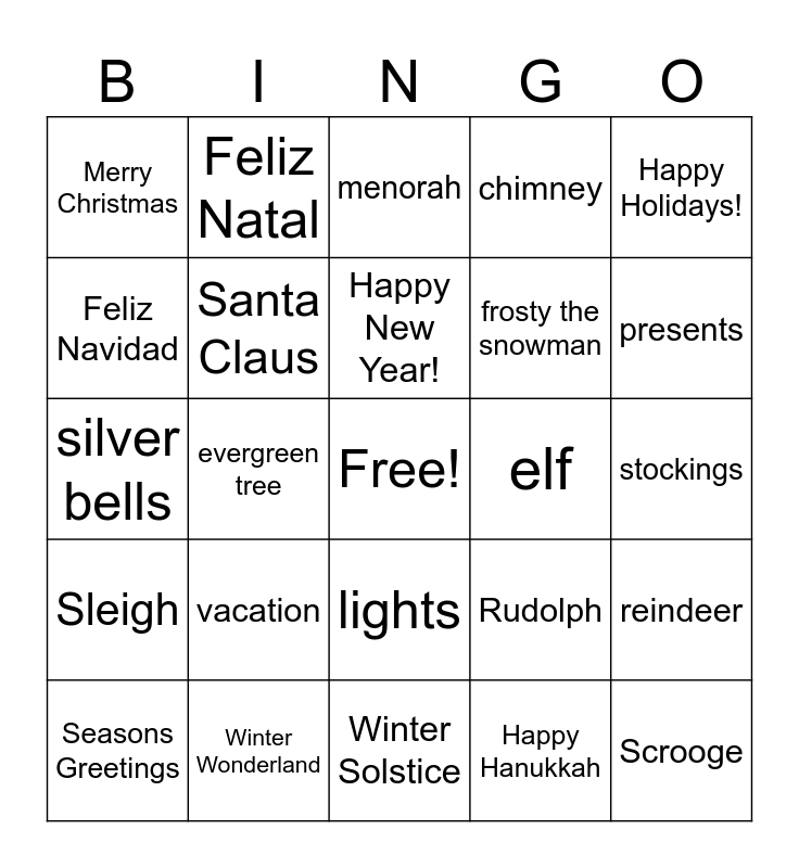 This bingo card has a free space and 24 words: vacation, Winter Wonderland, Happy New Year!, Seasons Greetings, Happy Holidays!, Merry Christmas, Feliz Navidad, Feliz Natal, elf, lights, frosty the snowman, silver bells, Rudolph, reindeer, Santa Claus, Happy Hanukkah, stockings, menorah, presents, evergreen tree, Scrooge, Sleigh, chimney and Winter Solstice.