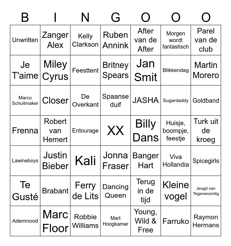 This bingo card has a free space and 48 words: Terug in de tijd, Blikkendag, Mart Hoogkamer, Robert van Hemert, De Overkant, Turk uit de kroeg, Zanger Alex, Marc Floor, Morgen wordt fantastisch, Jonna Fraser, Parel van de club, Ruben Annink, Sugardaddy, JASHA, Te Gusté, Huisje, boompje, feestje, Je T'aime, Martin Morero, Kleine vogel, After van de After, Jan Smit, Entourage, Unwritten, Miley Cyrus, Jeugd van Tegenwoordig, Feesttent, Goldband, Ademnood, Spaanse duif, Closer, Farruko, Billy Dans, Spicegirls, Brabant, Frenna, Banger Hart, Viva Hollandia, Marco Schuitmaker, Kali, Ferry de Lits, Lawineboys, Raymon Hermans, Kelly Clarkson, Robbie Williams, Britney Spears, Dancing Queen, Justin Bieber and Young, Wild & Free.