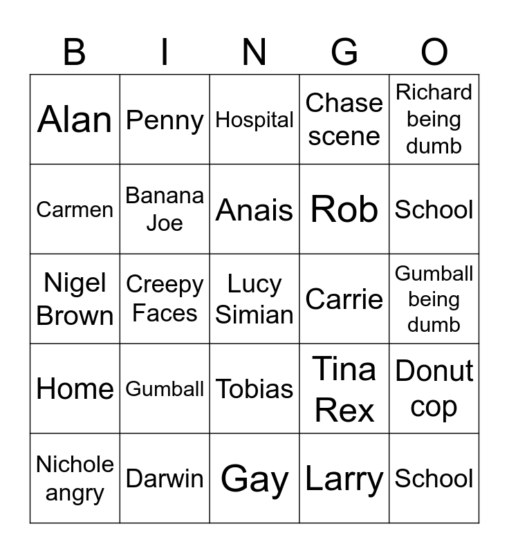 This bingo card has a free space and 24 words: Gumball, Darwin, Anais, Nichole angry, Richard being dumb, Alan, Carmen, Penny, Carrie, Tobias, Rob, Nigel Brown, Tina Rex, Donut cop, Banana Joe, Larry, Gumball being dumb, Hospital, School, Creepy Faces, School, Home, Chase scene and Gay.