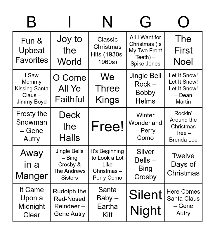This bingo card has a free space and 34 words: Traditional Christmas Hymns & Carols, Silent Night, O Holy Night, Hark! The Herald Angels Sing, Away in a Manger, O Come All Ye Faithful, The First Noel, It Came Upon a Midnight Clear, Joy to the World, Angels We Have Heard on High, We Three Kings, Classic Christmas Hits (1930s-1960s), White Christmas – Bing Crosby, Have Yourself a Merry Little Christmas – Judy Garland, Winter Wonderland – Perry Como, Let It Snow! Let It Snow! Let It Snow! – Dean Martin, Rudolph the Red-Nosed Reindeer – Gene Autry, Frosty the Snowman – Gene Autry, Jingle Bells – Bing Crosby & The Andrews Sisters, Silver Bells – Bing Crosby, It's Beginning to Look a Lot Like Christmas – Perry Como, The Christmas Song (Chestnuts Roasting on an Open Fire) – Nat King Cole, Fun & Upbeat Favorites, Rockin’ Around the Christmas Tree – Brenda Lee, Santa Baby – Eartha Kitt, Here Comes Santa Claus – Gene Autry, All I Want for Christmas (Is My Two Front Teeth) – Spike Jones, Sleigh Ride – The Ronettes, Jingle Bell Rock – Bobby Helms, I Saw Mommy Kissing Santa Claus – Jimmy Boyd, Group Singalong Favorites, Deck the Halls, Twelve Days of Christmas and We Wish You a Merry Christmas.