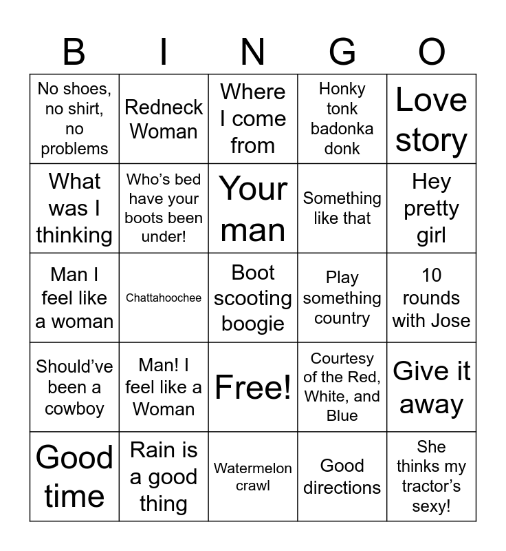 This bingo card has 26 words: Free!, Good directions, Your man, Rain is a good thing, Love story, No shoes, no shirt, no problems, What was I thinking, Redneck Woman, 10 rounds with Jose, Courtesy of the Red, White, and Blue, Something like that, Man I feel like a woman, Give it away, Good time, Chattahoochee, Days go by, Honky tonk badonka donk, Should’ve been a cowboy, Where I come from, Boot scooting boogie, Hey pretty girl, Watermelon crawl, Play something country, Man! I feel like a Woman, Who’s bed have your boots been under! and She thinks my tractor’s sexy!.