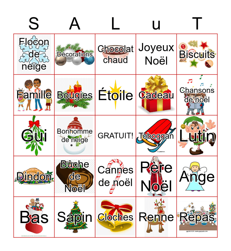 This bingo card has 23 images, a free space and 24 words: Bûche de Noël, Sapin, Étoile, Bas, Biscuits, Flocon de neige, Famille, Décorations, Toboggan, Cannes de noël, Cadeau, Gui, Père Noël, Ange, Bougies, Renne, Lutin, Chocolat chaud, Chansons de noël, Bonhomme de neige, Repas, Dindon, Joyeux Noël and Cloches.