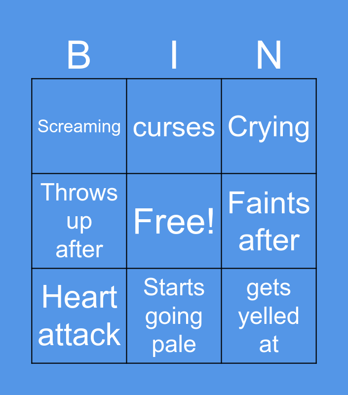 This bingo card has a free space and 14 words: Throws up before, Faints before, Faints after, Screaming, Crying, Throws up after, Phlebotomist makes funny comment, Runs out the room, Hits someone, curses, gets yelled at, Heart attack, Starts going pale and Starts going red.