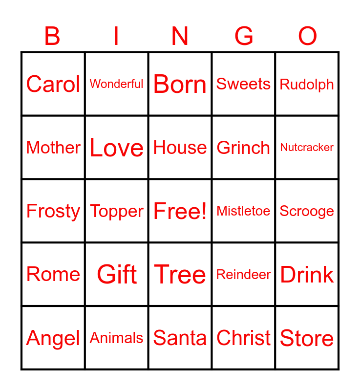 This bingo card has a free space and 24 words: Angel, Gift, House, Christ, Rudolph, Carol, Wonderful, Born, Mistletoe, Scrooge, Frosty, Love, Reindeer, Drink, Mother, Animals, Santa, Sweets, Nutcracker, Rome, Topper, Tree, Grinch and Store.