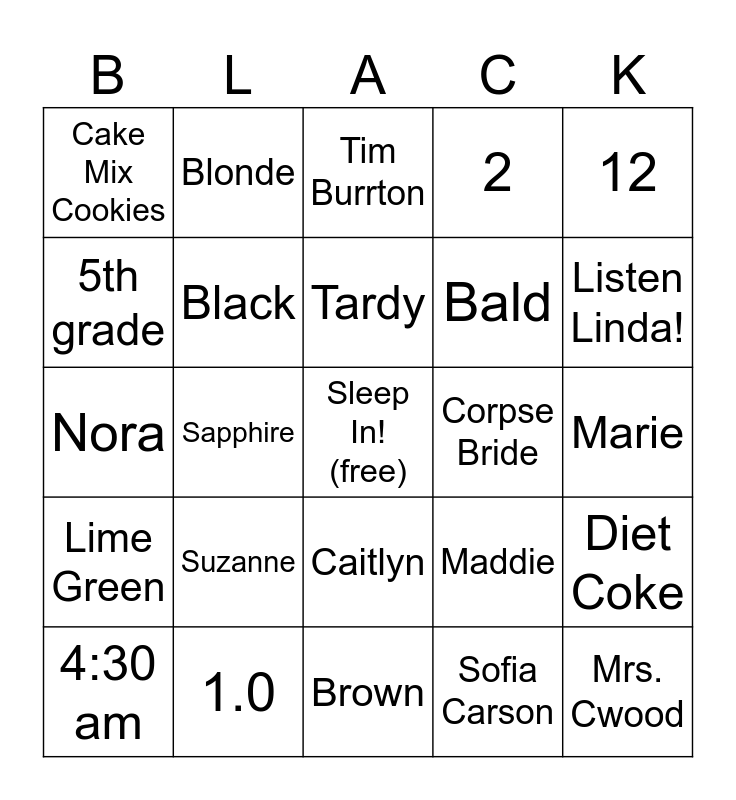 This bingo card has a free space and 29 words: 4:30 am, O.B., Sapphire, Dr. Pepper, Cake Mix Cookies, Tim Burrton, Black, Suzanne, Corpse Bride, 1.0, Marie, Mrs. Cwood, Brown, Sofia Carson, Listen Linda!, 4.0, Caitlyn, Lime Green, 12, Nora, Maddie, 5, Bald, 5th grade, 2, Blonde, Diet Coke, Tardy and Back Row Diva.