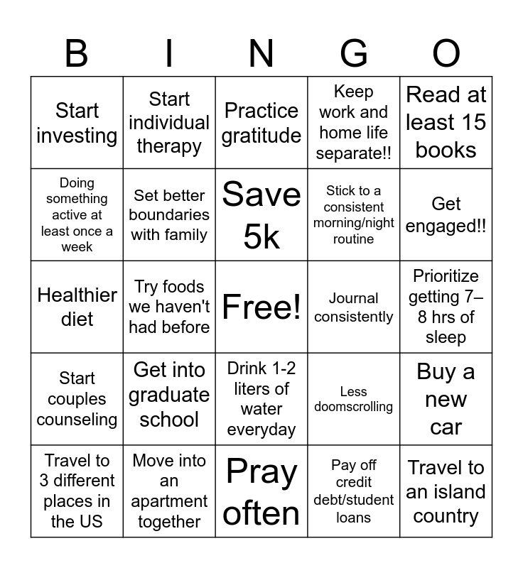 This bingo card has a free space and 24 words: Get into graduate school, Move into an apartment together, Save 5k, Travel to 3 different places in the US, Read at least 15 books, Start investing, Doing something active at least once a week, Start individual therapy, Journal consistently, Drink 1-2 liters of water everyday, Stick to a consistent morning/night routine, Healthier diet, Less doomscrolling, Buy a new car, Set better boundaries with family, Pay off credit debt/student loans, Prioritize getting 7–8 hrs of sleep, Practice gratitude, Get engaged!!, Try foods we haven't had before, Travel to an island country, Start couples counseling, Keep work and home life separate!! and Pray often.