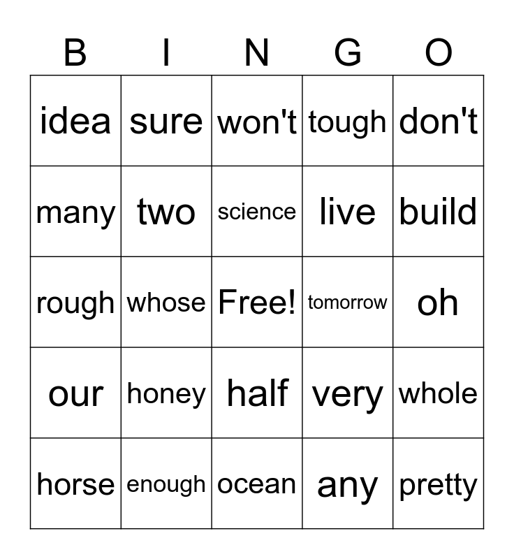 This bingo card has a free space and 28 words: whole, laugh, live, any, many, won't, sure, our, tomorrow, horse, rough, tough, enough, ocean, build, money, honey, two, science, half, idea, beautiful, pretty, whose, oh, very, don't and nothing.