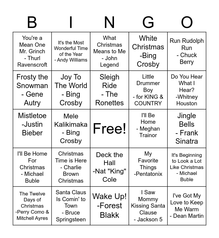 This bingo card has a free space and 63 words: Rockin' Around the Christmas Tree - Brenda Lee, All I want for Christmas is You - Mariah Carey, Jingle Bell Rock - Bobby Helms, It's Beginning to Look a Lot Like Christmas - Michael Buble, O Christmas Tree - Teddy Swims, Let It Snow! Let It Snow! Let It Snow! - Dean Martin, It's the Most Wonderful Time of the Year - Andy Williams, A Holly Jolly Christmas - Burl Ives, Sleigh Ride - The Ronettes, Last Christmas - Wham!, Deck the Hall -Nat "King" Cole, Underneath the Tree - Kelly Clarkson, Jingle Bells - Frank Sinatra, Run Rudolph Run - Chuck Berry, Feliz Navidad - Jose Feliciano, Frosty the Snowman - Gene Autry, Mele Kalikimaka - Bing Crosby, You're a Mean One Mr. Grinch - Thurl Ravenscroft, The Chanukah Song - Adam Sandler, Little Drummer Boy - for KING & COUNTRY, Christmas Time is Here - Charlie Brown Christmas, I'll Be Home For Christmas - Michael Buble, White Christmas -Bing Crosby, Santa Clause is Coming To Town - Jackson 5, Have Yourself a Merry Little Christmas - Frank Sinatra, Winter Wonderland - Michael Buble, Dominick the Donkey -Lou Monte, Santa Baby -Eartha Kitt, Baby, It's Cold Outside -Frank Sinatra, Christmas / Sarajevo -Trans-Siberian Orchestra, Santa Tell Me - Ariana Grande, Happy Holidays / The Holiday Season - Andy Williams, Christmas (Baby Please Come Home) -Darlene Love, I want a Hippopotamus for Christmas - Kasey Musgraves, Do You Hear What I Hear? -Whitney Houston, The Twelve Days of Christmas -Perry Como & Mitchell Ayres, Silver Bells - Dean Martin, I Saw Mommy Kissing Santa Clause - Jackson 5, Blue Christmas - Elvis Presley, Joy To The World - Bing Crosby, Mistletoe -Justin Bieber, I'll Be Home - Meghan Trainor, Carol of the Bells - Home Alone, Someday At Christmas - Stevie Wonder, I've Got My Love to Keep Me Warm - Dean Martin, Santa Claus Is Comin' to Town - Bruce Springsteen, Lonely This Christmas -Mud, My Favorite Things -Pentatonix, Happy Xmas (War Is Over) -John Lennon & Yoko Ono, God Rest Ye Merry Gentlemen - Pentatonix, You Make It Feel Like Christmas -Gwen Stefani, Wake Up! -Forest Blakk, What Are You Doing New Years Eve? -Ella Fitzgerald, Every Year, Every Christmas - Luther Vandross, Christmas Don't Be Late - Kasey Musgraves, What Christmas Means to Me - John Legend, Pretty Paper -Willie Nelson, Present Without a Bow -Kasey Musgraves, I Wish It Could Be Christmas Everyday -Wizzard, Oh Hanukkah -Jack Black, Do You Want to Build a Snowman -Frozen, Where Are You Christmas - The Grinch and The Christmas Shoes -NewSong.