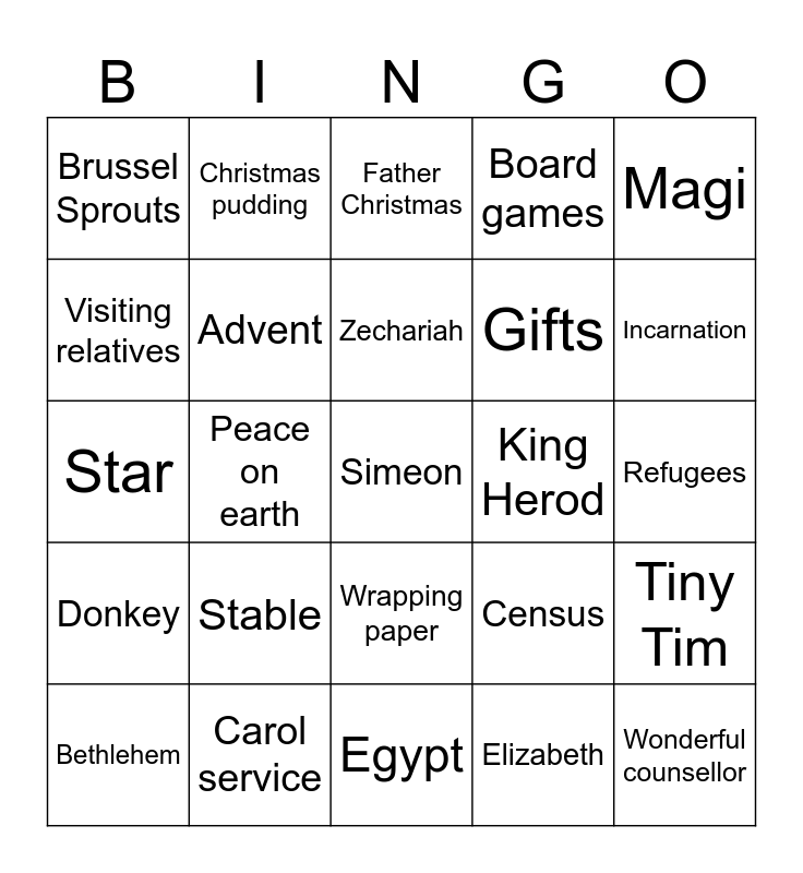 This bingo card has 30 words: Carol service, Beer and carols, Peace on earth, Pigs in blankets, Brussel Sprouts, Father Christmas, Advent, Wrapping paper, King Herod, Egypt, Refugees, Simeon, Elizabeth, Wonderful counsellor, Incarnation, Mulled wine, Census, Donkey, Stable, Magi, Star, Overeating, Christmas pudding, Gifts, Visiting relatives, Board games, Tiny Tim, Bethlehem, Zechariah and Magnificat.