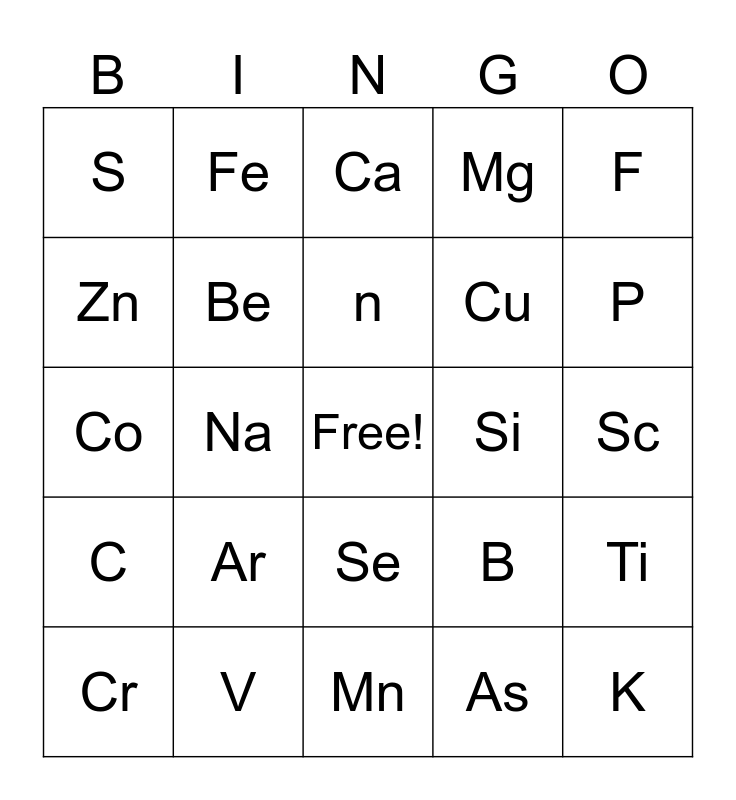 This bingo card has a free space and 36 words: H, He, Li, Be, B, C, n, O, F, Ne, Na, Mg, Al, Si, P, S, Cl, Ar, K, Ca, Sc, Ti, V, Cr, Mn, Fe, Co, Ni, Cu, Zn, Ga, Ge, As, Se, Br and Kr.