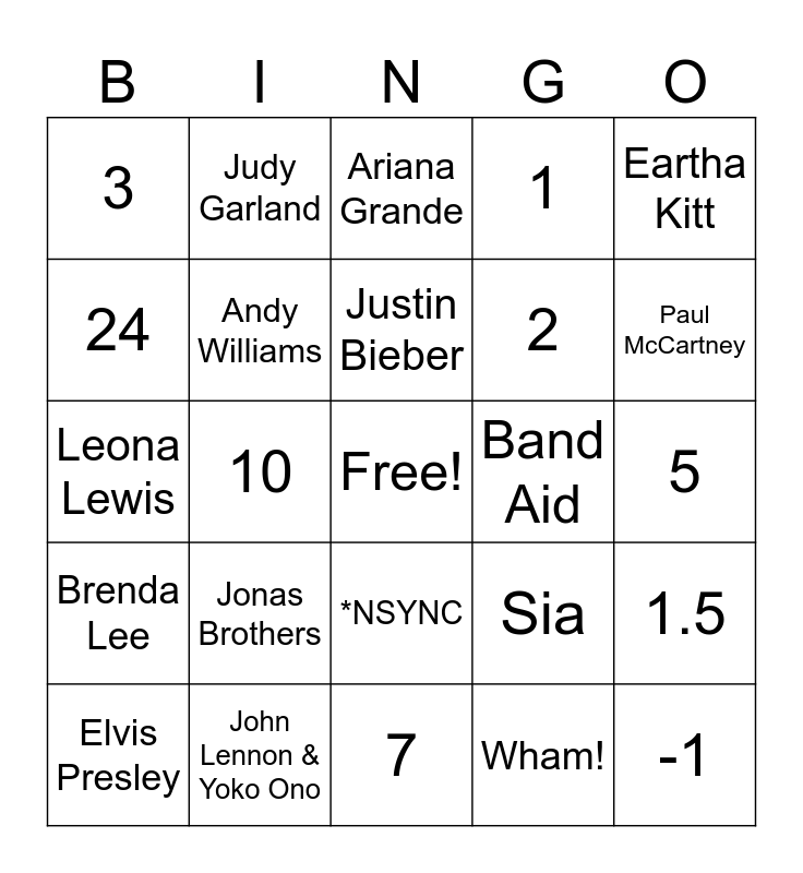 This bingo card has a free space and 34 words: Mariah Carey, Wham!, Bobby Helms, Bing Crosby, Brenda Lee, Andy Williams, Eartha Kitt, Elvis Presley, Judy Garland, Kelly Clarkson, Justin Bieber, Ariana Grande, Taylor Swift, Michael Bublé, Band Aid, Paul McCartney, John Lennon & Yoko Ono, Leona Lewis, Jonas Brothers, Sia, *NSYNC, 50, 3, 5, 7, -1, 1, 28, 2, 24, ½, 10, 1.5 and 6.