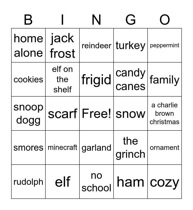 This bingo card has a free space and 24 words: minecraft, elf, frigid, rudolph, peppermint, home alone, cookies, jack frost, snow, garland, candy canes, snoop dogg, the grinch, ornament, elf on the shelf, ham, a charlie brown christmas, reindeer, family, scarf, cozy, smores, turkey and no school.
