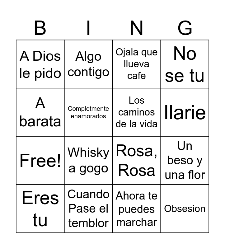 This bingo card has 20 words: Un beso y una flor, Mariposa Technicolor, Ojala que llueva cafe, No se tu, Eres tu, A barata, Cuando Pase el temblor, A Dios le pido, Free!, Algo contigo, Whisky a gogo, Rosa, Rosa, Completmente enamorados, Obsesion, Los caminos de la vida, La Plaga, Ilarie, No se tu, Ahora te puedes marchar and Nada fue un error.