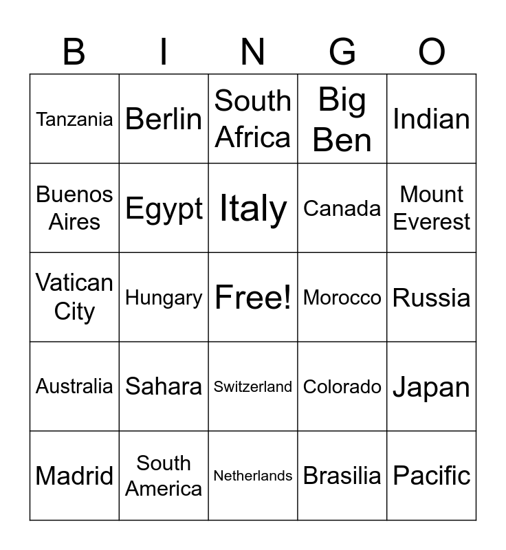 This bingo card has a free space and 29 words: Madrid, Nile, Hungary, Coliseum, Tanzania, South Africa, Egypt, Sahara, Morocco, South America, Russia, Pacific, Netherlands, Brasilia, Mount Everest, China, Switzerland, Australia, Indian, Vatican City, Colorado, Africa, Canada, Buenos Aires, Big Ben, Berlin, Japan, Italy and Cairo.