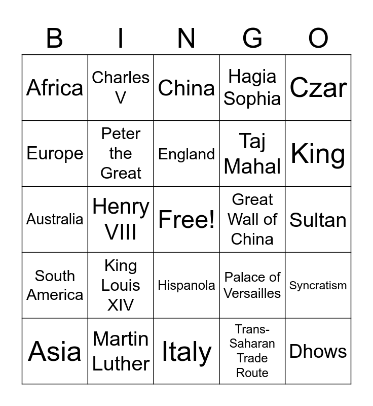 This bingo card has a free space and 43 words: North America, Martin Luther, France, Palace of Versailles, Heliocentric, South America, Peter the Great, St. Petersburg, Hagia Sophia, Monarch, Africa, Mansa Musa, Great Wall of China, Syncratism, Asia, Zheng He, Hispanola, Taj Mahal, Globalization, Europe, Charles V, Constantinople, Tenochtitlan, Czar, Antarctica, Guttenburg, Italy, University of Timbuktu, Dhows, Australia, Galileo, England, Silk Road, Sultan, Suleiman the Magnificent, Russia, Trans-Saharan Trade Route, King, Henry VIII, China, Mandate of Heaven, King Louis XIV and Ethiopia.