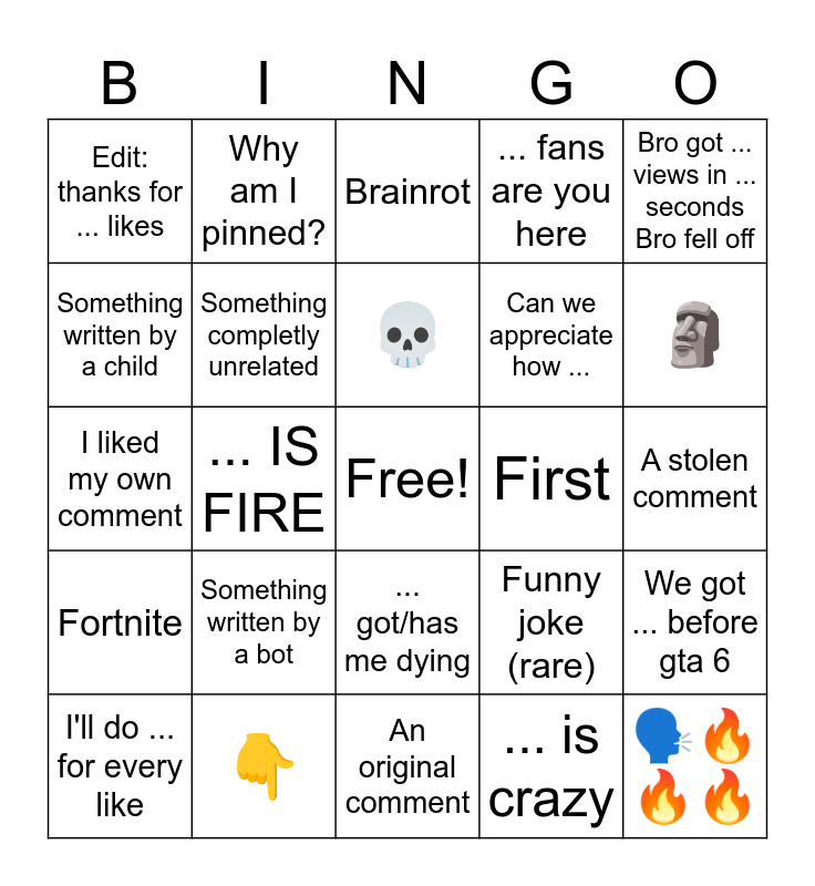 This bingo card has a free space and 24 words: Something written by a bot, 👇, 💀, I'll do ... for every like, Bro got ... views in ... seconds Bro fell off, Edit: thanks for ... likes, Something written by a child, Why am I pinned?, First, ... got/has me dying, Can we appreciate how ..., I liked my own comment, Funny joke (rare), We got ... before gta 6, Something completly unrelated, ... is crazy, A stolen comment, Brainrot, 🗿, ... IS FIRE, 🗣🔥🔥🔥, Fortnite, ... fans are you here and An original comment.