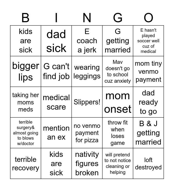 This bingo card has a free space and 24 words: mention an ex, kids are sick, wearing leggings, terrible recovery, E hasn't played soccer well cuz of medical, kids are sick, bigger lips, dad sick, mom onset, no venmo payment for pizza, Mav doesn't go to school cuz anxiety, taking her moms meds, throw fit when loses game, B & J getting married, G can't find job, will pretend to not notice cleaning or helping, dad ready to go, E coach a jerk, mom tiny venmo payment, medical scare, loft destroyed, terrible surgery& almost going to blows w/doctor, G getting married and nativity figures broken.