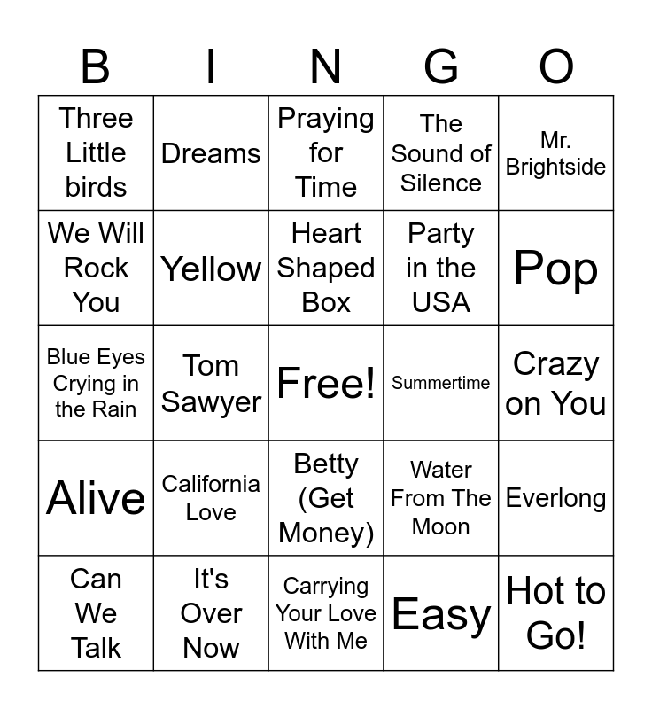 This bingo card has a free space and 27 words: Water From The Moon, The Dance, Party in the USA, Carrying Your Love With Me, We Will Rock You, Praying for Time, Dreams, Alive, Summertime, Everlong, Blue Eyes Crying in the Rain, The Sound of Silence, Can We Talk, It's Over Now, Pop, Planet Rock 2k, Yellow, Heart Shaped Box, California Love, Three Little birds, Crazy on You, Easy, Tom Sawyer, Hot to Go!, Betty (Get Money), Mr. Brightside and Joy of my life.