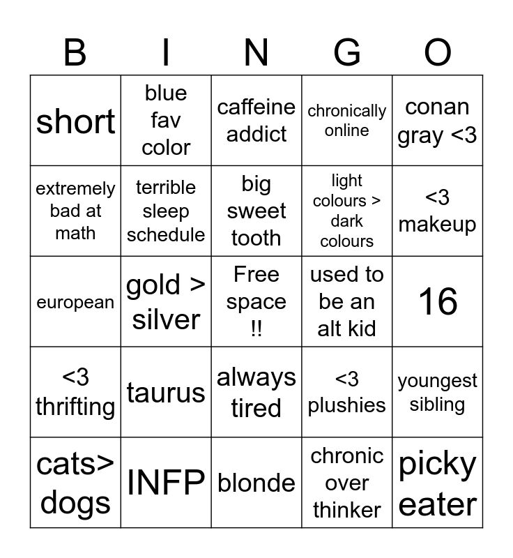 This bingo card has a free space and 24 words: taurus, INFP, big sweet tooth, cats> dogs, conan gray <3, short, extremely bad at math, blue fav color, used to be an alt kid, always tired, light colours > dark colours, european, <3 plushies, youngest sibling, terrible sleep schedule, chronic over thinker, 16, caffeine addict, <3 makeup, gold > silver, picky eater, <3 thrifting, chronically online and blonde.