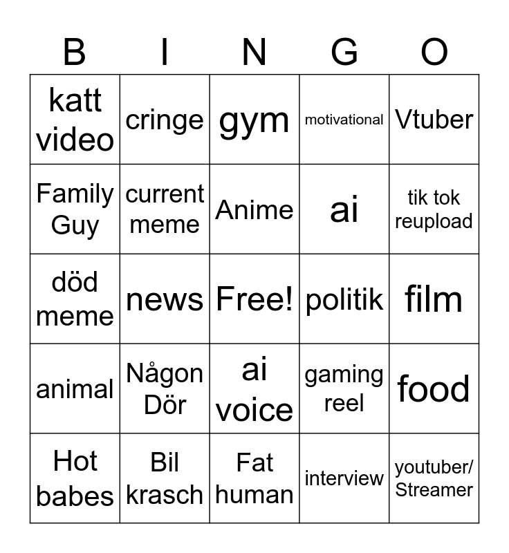 This bingo card has a free space and 24 words: Någon Dör, Bil krasch, Anime, Hot babes, Vtuber, katt video, Family Guy, cringe, politik, ai voice, ai, död meme, gaming reel, food, current meme, interview, film, gym, tik tok reupload, news, youtuber/ Streamer, animal, motivational and Fat human.