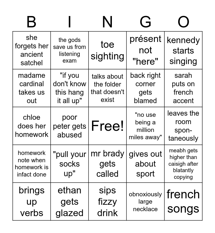 This bingo card has a free space and 24 words: "pull your socks up", ethan gets glazed, talks about the folder that doesn't exist, brings up verbs, kennedy starts singing, she forgets her ancient satchel, madame cardinal takes us out, the gods save us from listening exam, "no use being a million miles away", mr brady gets called, back right corner gets blamed, chloe does her homework, gives out about sport, meabh gets higher than caisigh after blatantly copying, "if you don't know this hang it all up", obnoxiously large necklace, leaves the room spon-taneously, toe sighting, sarah puts on french accent, poor peter gets abused, french songs, homework note when homework is infact done, présent not "here" and sips fizzy drink.