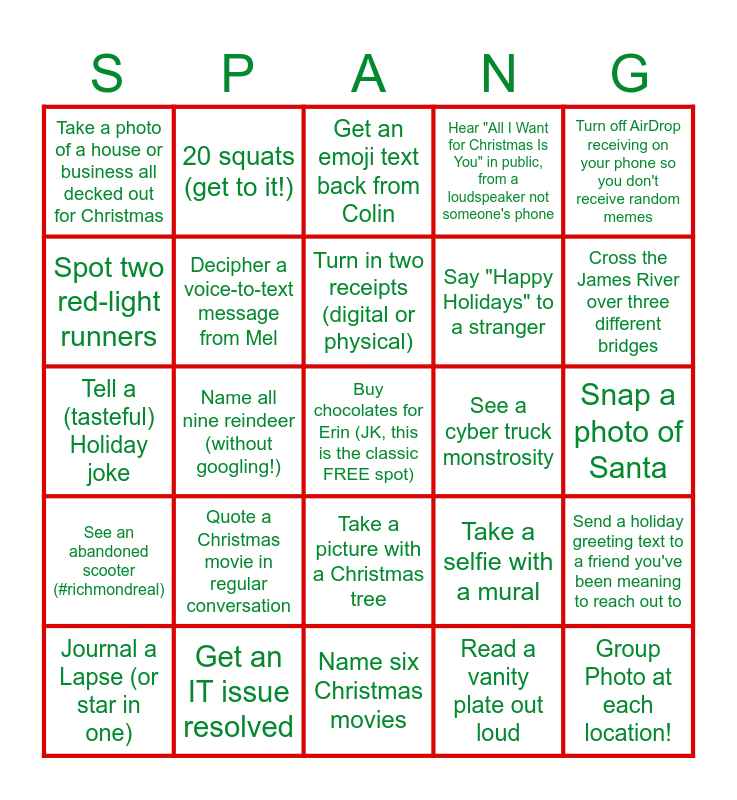 This bingo card has a free space and 24 words: Quote a Christmas movie in regular conversation, Get an IT issue resolved, Turn in two receipts (digital or physical), Journal a Lapse (or star in one), Turn off AirDrop receiving on your phone so you don't receive random memes, Take a photo of a house or business all decked out for Christmas, Spot two red-light runners, 20 squats (get to it!), See a cyber truck monstrosity, Take a picture with a Christmas tree, Say "Happy Holidays" to a stranger, Tell a (tasteful) Holiday joke, Take a selfie with a mural, Send a holiday greeting text to a friend you've been meaning to reach out to, Decipher a voice-to-text message from Mel, Read a vanity plate out loud, Snap a photo of Santa, Get an emoji text back from Colin, Cross the James River over three different bridges, Name all nine reindeer (without googling!), Group Photo at each location!, See an abandoned scooter (#richmondreal), Hear "All I Want for Christmas Is You" in public, from a loudspeaker not someone's phone and Name six Christmas movies.