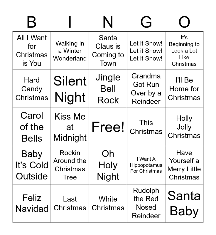 This bingo card has a free space and 24 words: Rockin Around the Christmas Tree, Last Christmas, Jingle Bell Rock, Feliz Navidad, It's Beginning to Look a Lot Like Christmas, All I Want for Christmas is You, Hard Candy Christmas, Walking in a Winter Wonderland, This Christmas, Oh Holy Night, Grandma Got Run Over by a Reindeer, Carol of the Bells, I Want A Hippopotamus For Christmas, Have Yourself a Merry Little Christmas, Silent Night, Rudolph the Red Nosed Reindeer, Holly Jolly Christmas, Santa Claus is Coming to Town, I'll Be Home for Christmas, Kiss Me at Midnight, Santa Baby, Baby It's Cold Outside, Let it Snow! Let it Snow! Let it Snow! and White Christmas.