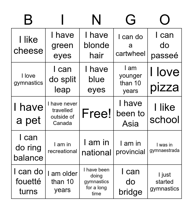 This bingo card has a free space and 34 words: I can do splits, I can do bridge, I can do kicks, I can do penché, I can do ring balance, I can do split leap, I can do passeé, I can do fouetté turns, I have green eyes, I have brown eyes, I have blue eyes, I have blonde hair, I have black hair, I have been to europe, I have been to Asia, I love pizza, I am older than 10 years, I have a pet, I am in recreational, I am in provincial, I am in national, I have been to a competition, I like cheese, I like school, I have been doing gymnastics for a long time, I just started gymnastics, I can do a cartwheel, I can do a walkover, I am younger than 10 years, I love gymnastics, I can point my toes, I have never travelled outside of Canada, I was in gymnaestrada and I can do penché turn.