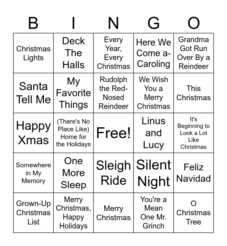 This bingo card has a free space and 87 words: All I Want for Christmas Is You, Last Christmas, Sleigh Ride, Underneath the Tree, It's The Most Wonderful Time of the Year, Let It Snow! Let It Snow! Let It Snow!, Rockin' Around the Christmas Tree, Here Comes Santa Claus, Christmas (Baby Please Come Home), Blue Christmas, Jingle Bell Rock, White Christmas, Feliz Navidad, It's Beginning to Look a Lot Like Christmas, A Holly Jolly Christmas, Rudolph the Red-Nosed Reindeer, Santa Claus Is Comin' to Town, Silver Bells, Little Saint Nick, Mele Kalikimaka, Winter Wonderland, Happy Holiday/The Holiday Season, Happy Xmas, Run Rudolph Run, You're a Mean One Mr. Grinch, Wonderful Christmastime, Baby, It's Cold Outside, The Christmas Song, Christmas Time Is Here, Carol of the Bells, Merry Christmas, Happy Holidays, A Marshmallow World, God Rest Ye Merry Gentlemen, One More Sleep, Santa Tell Me, Have Yourself a Merry Little Christmas, This Christmas, What Christmas Means to Me, I'll Be Home For Christmas, (There's No Place Like) Home for the Holidays, Mary, Did You Know?, The First Noel, My Only Wish (This Year), Linus and Lucy, Up On The House Top, Grandma Got Run Over By a Reindeer, Hallelujah, Deck The Halls, Do You Hear What I Hear?, We Need a Little Christmas, Oh Santa!, Little Drummer Boy, Somewhere in My Memory, I Want a Hippopotamus for Christmas, O Holy Night, O Come, Ye Faithful, We Wish You a Merry Christmas, Frosty The Snowman, Hark! The Herald Angels Sing, Here We Come a-Caroling, My Favorite Things, Hard Candy Christmas, What a Wonderful World, My Kind of Present, The Twelve Days of Christmas, 8 Days of Christmas, Christmas In Hollis, Grown-Up Christmas List, O Christmas Tree, Merry Christmas Everyone, Christmas In Dixie, You Make It Feel Like Christmas, Every Year, Every Christmas, Silent Night, Like It's Christmas, When A Child Is Born, Santa Claus Is Back In Town, Merry Christmas, When You Believe, Mary's Boy Child, The Little Drummer Boy, Santa Bring My Baby Back, Shake Up Christmas, I Saw Mommy Kissing Santa Claus, Merry Christmas To You, Christmas Lights and Mistletoe.