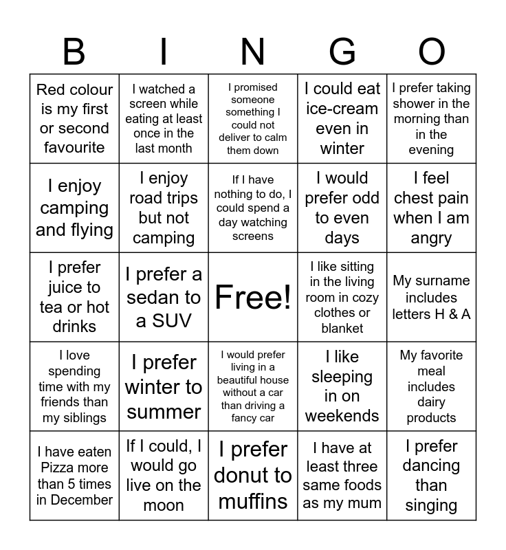 This bingo card has a free space and 24 words: I have eaten Pizza more than 5 times in December, I prefer winter to summer, If I have nothing to do, I could spend a day watching screens, I have at least three same foods as my mum, I prefer taking shower in the morning than in the evening, Red colour is my first or second favourite, I watched a screen while eating at least once in the last month, I promised someone something I could not deliver to calm them down, I like sitting in the living room in cozy clothes or blanket, My surname includes letters H & A, I prefer juice to tea or hot drinks, I enjoy road trips but not camping, I like sleeping in on weekends, My favorite meal includes dairy products, I enjoy camping and flying, If I could, I would go live on the moon, I prefer donut to muffins, I could eat ice-cream even in winter, I feel chest pain when I am angry, I love spending time with my friends than my siblings, I prefer a sedan to a SUV, I would prefer living in a beautiful house without a car than driving a fancy car, I would prefer odd to even days and I prefer dancing than singing.