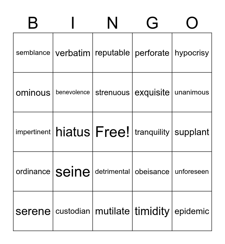 This bingo card has a free space and 32 words: timidity, apprehension, hiatus, vilify, ordinance, benevolence, hypocrisy, unforeseen, verbatim, inauguration, strenuous, reputable, delirious, recommendation, tranquility, staunch, serene, impertinent, detrimental, seine, obeisance, liaison, supplant, custodian, epidemic, perforate, exquisite, ominous, semblance, mutilate, elocution and unanimous.