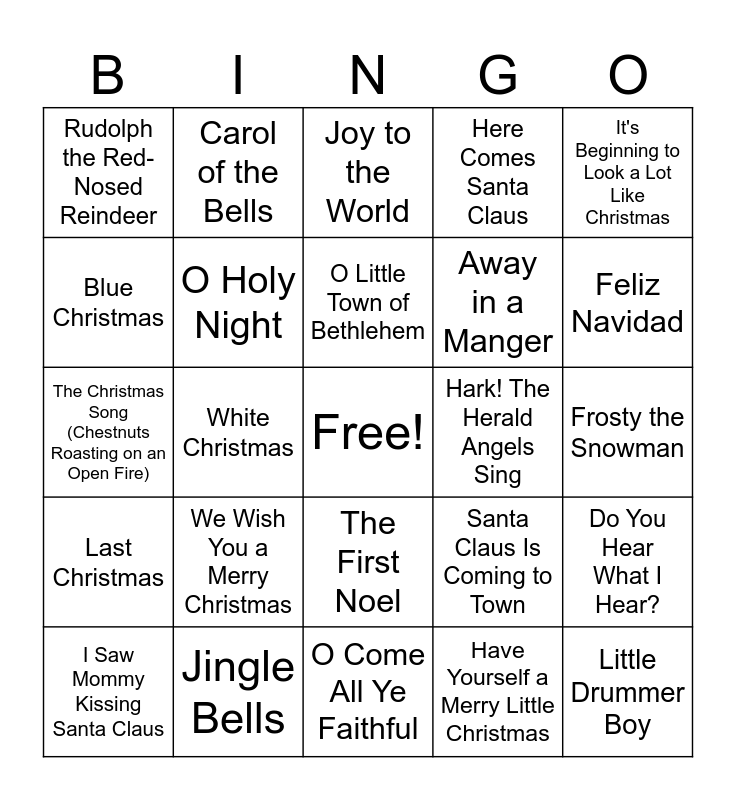 This bingo card has a free space and 30 words: Jingle Bells, Silent Night, White Christmas, Deck the Halls, Rudolph the Red-Nosed Reindeer, Joy to the World, O Holy Night, The First Noel, Hark! The Herald Angels Sing, O Come All Ye Faithful, Frosty the Snowman, Little Drummer Boy, Have Yourself a Merry Little Christmas, All I Want for Christmas Is You, Feliz Navidad, Rockin' Around the Christmas Tree, Santa Claus Is Coming to Town, Last Christmas, We Wish You a Merry Christmas, It's Beginning to Look a Lot Like Christmas, The Christmas Song (Chestnuts Roasting on an Open Fire), Jingle Bell Rock, Carol of the Bells, Away in a Manger, Blue Christmas, Here Comes Santa Claus, Do You Hear What I Hear?, I Saw Mommy Kissing Santa Claus, O Little Town of Bethlehem and Good King Wenceslas.