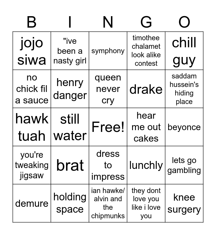 This bingo card has a free space and 24 words: brat, holding space, queen never cry, demure, chill guy, jojo siwa, no chick fil a sauce, "ive been a nasty girl, hear me out cakes, dress to impress, drake, hawk tuah, lunchly, lets go gambling, henry danger, they dont love you like i love you, beyonce, symphony, saddam hussein's hiding place, still water, knee surgery, you're tweaking jigsaw, timothee chalamet look alike contest and ian hawke/ alvin and the chipmunks.