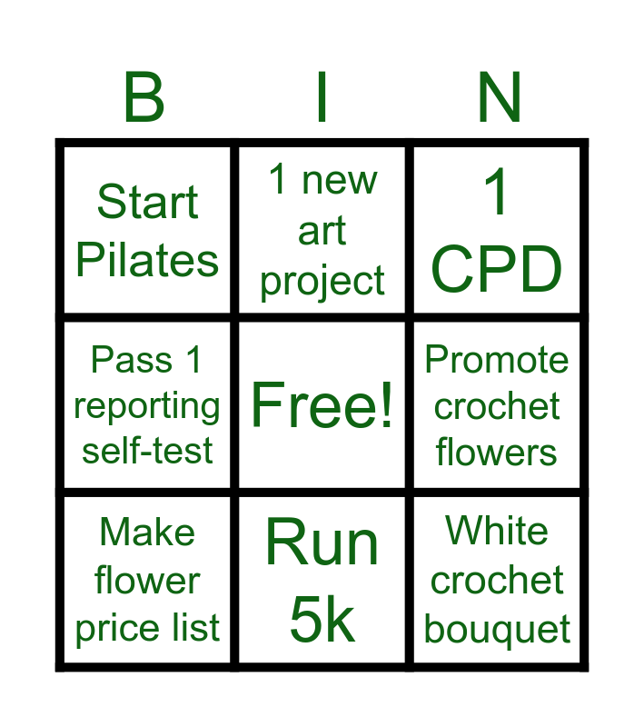 This bingo card has a free space and 8 words: Pass 1 reporting self-test, 1 new art project, Promote crochet flowers, Make flower price list, 1 CPD, Start Pilates, Run 5k and White crochet bouquet.