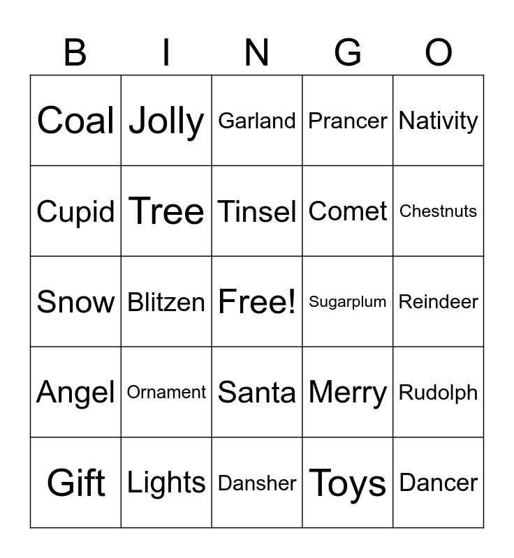 This bingo card has a free space and 34 words: Candy, Toys, Stocking, Cookies, Angel, Tree, Nativity, Gift, Jolly, Elf, Tinsel, Garland, Mistletoe, Scrooge, Sugarplum, Chestnuts, Lights, Snow, Ornament, Merry, Santa, Ribbon, Coal, Reindeer, Dansher, Dancer, Prancer, Vixen, Comet, Cupid, Donner, Blitzen, Rudolph and Sleigh.