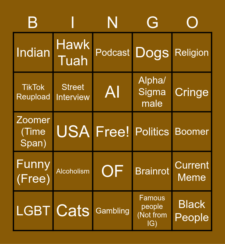This bingo card has a free space and 24 words: Alcoholism, Cats, AI, LGBT, Religion, Indian, TikTok Reupload, Hawk Tuah, Politics, OF, Alpha/ Sigma male, Zoomer (Time Span), Brainrot, Current Meme, Street Interview, Famous people (Not from IG), Boomer, Podcast, Cringe, USA, Black People, Funny (Free), Dogs and Gambling.