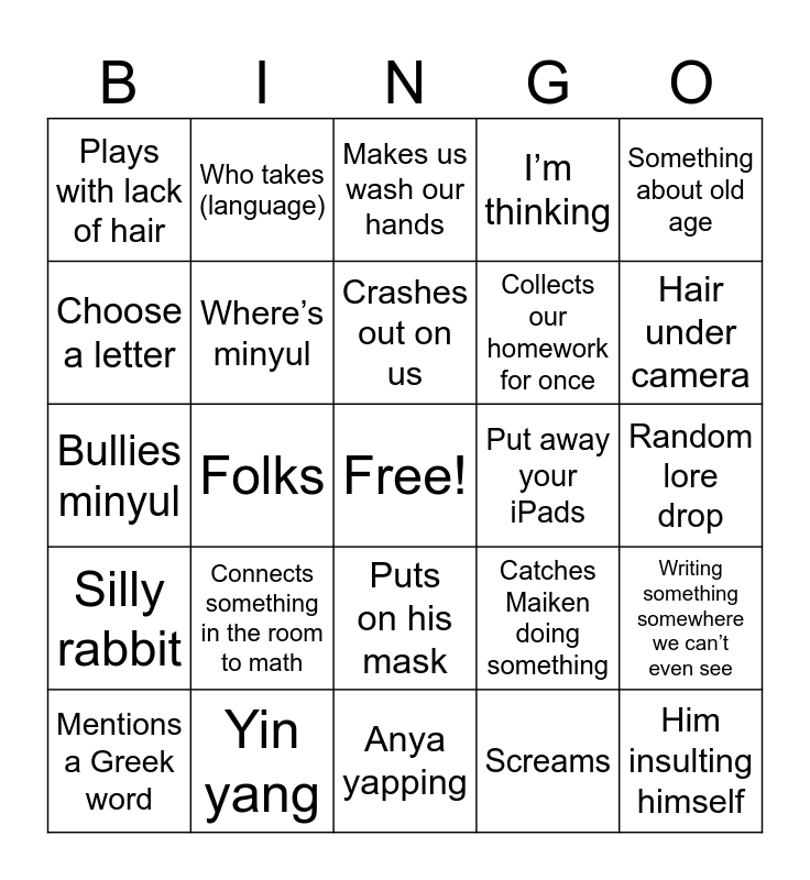 This bingo card has a free space and 32 words: Screams, Ed-ges, Folks, Talks about a random building/subject unrelated to math, Silly rabbit, Where’s minyul, Something about old age, Writing something somewhere we can’t even see, Who takes (language), Buenos notches, Crashes out on us, Makes us wash our hands, Plays hangman, Mentions heritage/ppls parents, Put away your iPads, Look at the screen (angrily), Mentions a Greek word, Bullies minyul, Puts on his mask, Connects something in the room to math, Catches Maiken doing something, Gives us a random quiz, Random lore drop, Yin yang, Him insulting himself, I’m thinking, Collects our homework for once, Choose a letter, Plays with lack of hair, Anya yapping, Very good/very nice and Hair under camera.