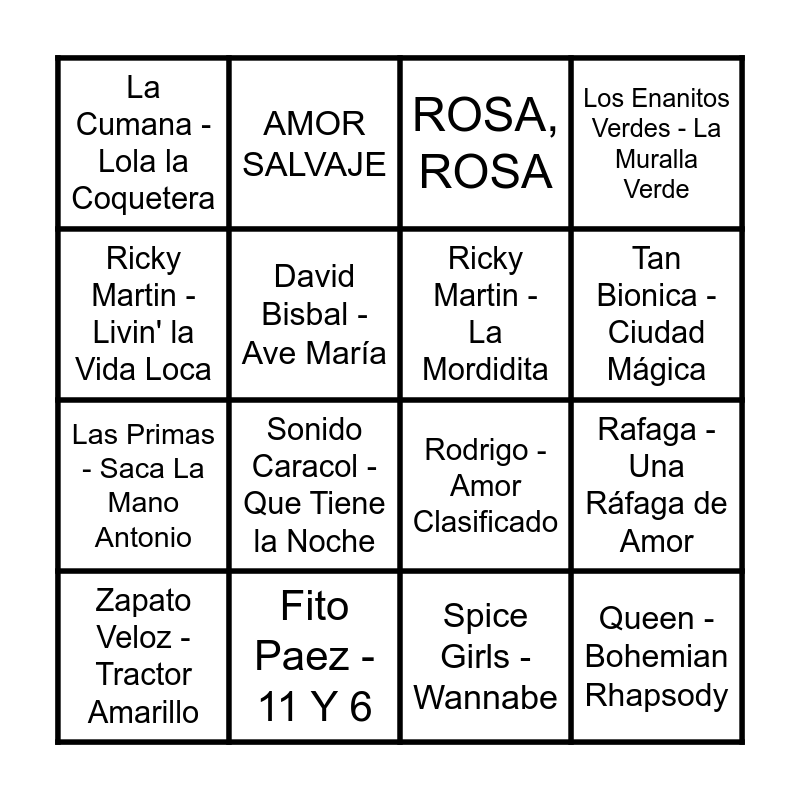 ⚠ This card has duplicate items: Las Primas - Saca La Mano Antonio (2), Gladys "La bomba tucumana" - La Pollera Amarilla (2), Los Del Rio - Macarena (2), Ricky Martin - Livin' la Vida Loca (2), David Bisbal - Ave María (2), Chayanne - Torero (2), Daddy Yankee - Gasolina (2), Pimpinela - Olvídame y Pega la Vuelta (2), Juanes - La Camisa Negra (2), Britney Spears - ...Baby One More Time (2), Backstreet Boys - I Want It That Way (2), ABBA - Dancing Queen (2), Marc Anthony - Vivir Mi Vida (2), Azucar Moreno - Solo Se Vive una Vez (2), Village People - YMCA (2), Bee Gees - Stayin Alive (2), Spice Girls - Wannabe (2), Fito Paez - El amor después del amor (2), Vilma Palma e Vampiros - Auto rojo (2), Cristian Castro - Lloviendo Estrellas (2), Rodrigo - Amor Clasificado (2), Los Charros - Amores Como el Nuestro (2), El Polaco - Deja De Llorar (2), Luck Ra - La Morocha (2), Luis Miguel - Ahora Te Puedes Marchar (2), La K'onga - Universo Paralelo (2), Coti - Nada Fue Un Error (2), Julieta Venegas - Me Voy (2), Miranda! - Don (2), TINI - La Triple T (2), Daddy Yankee - Llamado de Emergencia (3), Los Totora - Márchate ahora (2), Gilda - No Me Arrepiento de Este Amor (2), Bacilos - Caraluna (2), Chaqueño Palavecino - La Ley y La Trampa (2), Jesse & Joy - ¡Corre! (2), Reik - Noviembre Sin Ti (2), Migrantes - Si Me Tomo Una Cerveza (2), Luciano Pereyra - Porque Aun Te Amo (2), Paulina Rubio - Ni Una Sola Palabra (2), Cristian Castro - Azul (2), Alcides - Violeta (2), Gilda - Se Me Ha Perdido Un Corazón (2), DLG - La Quiero A Morir (2), Chocolate - Mayonesa (2), Chino & Nacho - Niña Bonita (2), Rafaga - Mentirosa (2), Commanche - Tonta (2), Los Palmeras - El Bombón (2), Zapato Veloz - Tractor Amarillo (2), Xuxa - Ilarié (2), Conjunto Casino de Uruguay - Azuquita Pa'l Cafe (2), Grupo Sombras - La Ventanita (2), Los Fatales - Bicho Bicho (2), Nestor En Bloque - Una Calle Nos Separa (2), Fey - Azúcar Amargo (2), La Mona Jimenez - Beso a beso (2), Mayonesa - Agachadita (2), Azul Azul - La Bomba (2), Karibe con K - Polvo de Estrellas (2), Monterrojo - Bailadora (2), Karibe con K - Amores Como el Nuestro (2), Nietos del Futuro - Gelatina (2), Marama - Nena (2), La Cumana - Lola la Coquetera (2), Sonido Caracol - Que Tiene la Noche (2), Loco Mía - Locomia (2), Rafaga - Una Ráfaga de Amor (2), Rodrigo - Soy Cordobes (2), Ricardo Montaner - Tan Enamorados (2), Lucas Sugo - Cinco Minutos (2), Sergio Dalma - Bailar Pegados (2), Valeria Lynch - Me Das Cada Día Más (2), Américo - Te Vas (2), Rafaga - Una Cerveza (2), Karina - Corazon Mentiroso (2), No Te Va Gustar - A las Nueve (2), Tan Bionica - Ciudad Mágica (2), Los Enanitos Verdes - La Muralla Verde (2), No Te Va Gustar - Chau (2), Matías Valdez - Latidos (2), Attaque 77 - Arrancacorazones (2), Airbag - Amor de verano (2), Pappo - Juntos a la Par (2), Ciro y los Persas - Vas a Bailar (2), Queen - Bohemian Rhapsody (2), j mena - La Cobra (2), Shakira - Ciega, Sordomuda (2), Fito Paez - 11 Y 6 (2), No Te Va Gustar - Cielo De Un Solo Color (2), Patricio Rey y sus Redonditos de Ricota - Mi Perro Dinamita (2)