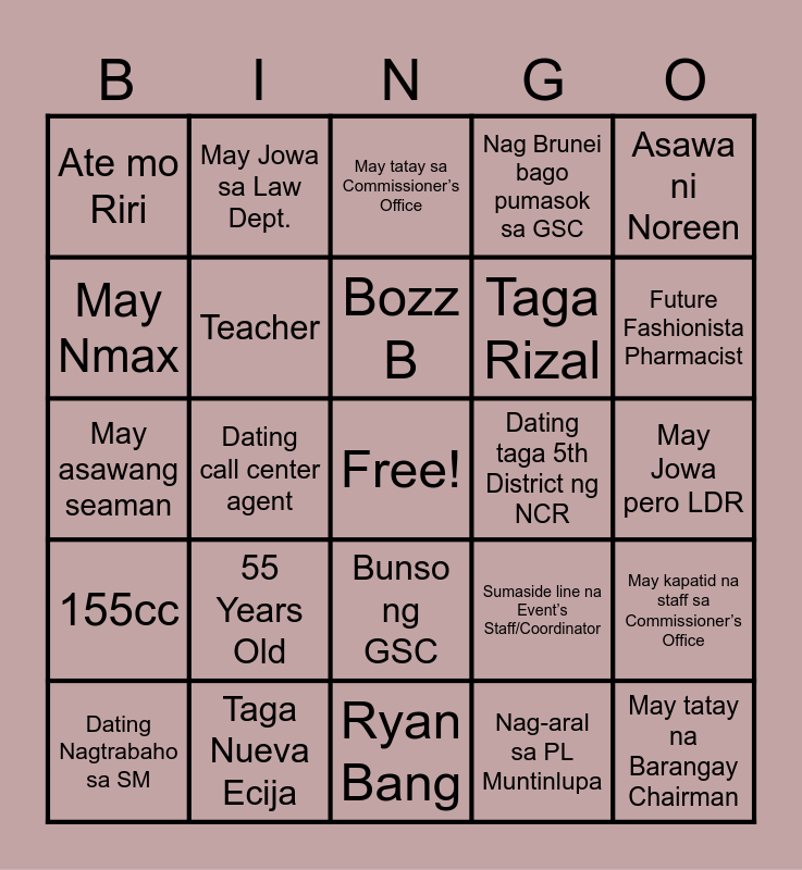 This bingo card has a free space and 27 words: Sumaside line na Event’s Staff/Coordinator, May Kapatid na Division Chief, Taga Rizal, Ryan Bang, May Nmax, May tatay sa Commissioner’s Office, May Jowa sa Law Dept., 155cc, Dating taga 5th District ng NCR, May kapatid na staff sa Commissioner’s Office, May asawang seaman, Nag Brunei bago pumasok sa GSC, Dating Nagtrabaho sa SM, Taga Nueva Ecija, Future Fashionista Pharmacist, May Kapatid sa Law Dept., Teacher, Bozz B, 55 Years Old, Ate mo Riri, May Jowa pero LDR, Nag-aral sa PL Muntinlupa, Dating call center agent, May tatay na Barangay Chairman, Bunso ng GSC, Asawa ni Noreen and May Law Firm.
