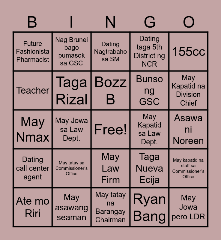 This bingo card has a free space and 27 words: Taga Nueva Ecija, 55 Years Old, Bunso ng GSC, May tatay na Barangay Chairman, Teacher, Dating Nagtrabaho sa SM, Nag Brunei bago pumasok sa GSC, Dating call center agent, May Kapatid sa Law Dept., May kapatid na staff sa Commissioner’s Office, May Nmax, Dating taga 5th District ng NCR, Ate mo Riri, May asawang seaman, May Kapatid na Division Chief, Nag-aral sa PL Muntinlupa, Taga Rizal, Bozz B, May tatay sa Commissioner’s Office, Future Fashionista Pharmacist, Asawa ni Noreen, Ryan Bang, May Jowa sa Law Dept., May Jowa pero LDR, May Law Firm, 155cc and Sumaside line na Event’s Staff/Coordinator.