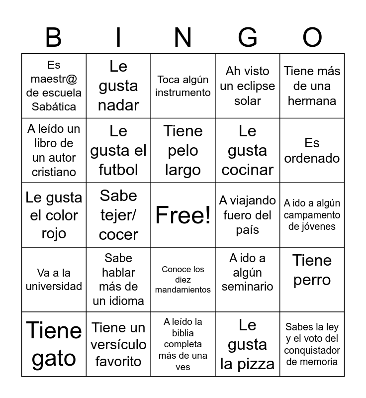 This bingo card has a free space and 24 words: Sabe hablar más de un idioma, Tiene un versículo favorito, Tiene pelo largo, Tiene gato, Tiene más de una hermana, Es maestr@ de escuela Sabática, A leído un libro de un autor cristiano, Le gusta nadar, A viajando fuero del país, Conoce los diez mandamientos, Le gusta cocinar, Le gusta el color rojo, A ido a algún seminario, Tiene perro, Le gusta el futbol, Le gusta la pizza, A ido a algún campamento de jóvenes, Toca algún instrumento, Es ordenado, Sabe tejer/ cocer, Sabes la ley y el voto del conquistador de memoria, Va a la universidad, Ah visto un eclipse solar and A leído la biblia completa más de una ves.