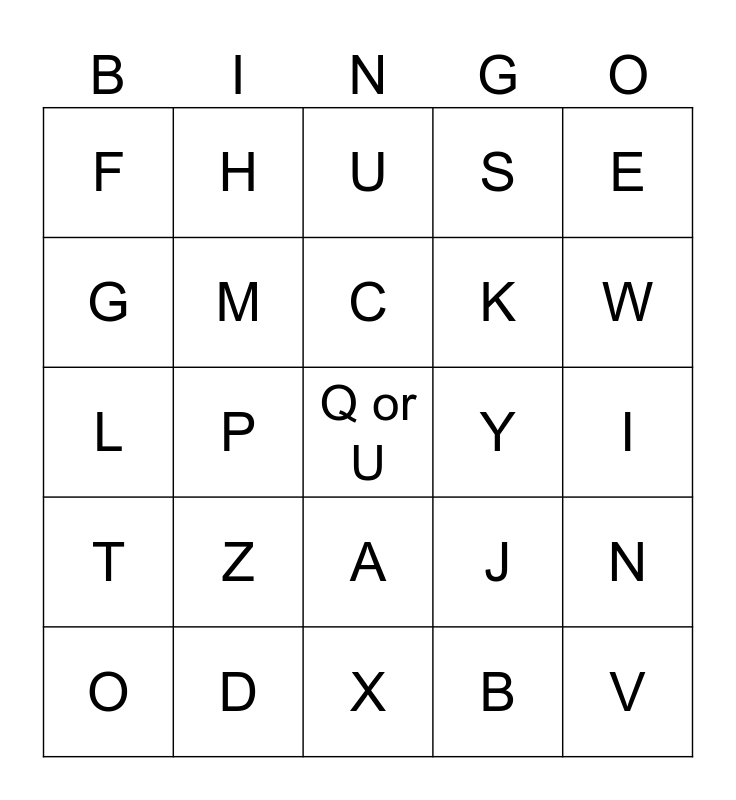 This bingo card has a free space and 26 words: A, B, C, D, E, F, G, H, I, J, K, L, N, O, P, R, S, T, U, V, W, X, Y, Z, M and Q.