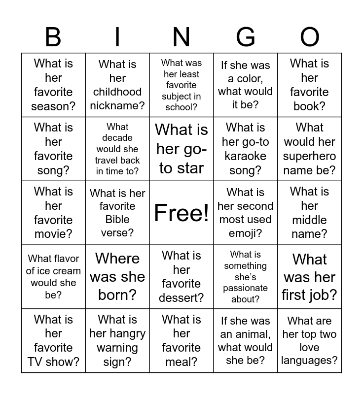This bingo card has a free space and 25 words: Where was she born?, What is her favorite meal?, What is her go-to star, What is her favorite TV show?, What is her favorite book?, What is her favorite season?, What is her favorite song?, What is her childhood nickname?, What is her second most used emoji?, What is her favorite dessert?, What is her go-to karaoke song?, What is her favorite movie?, What is something she’s passionate about?, What was her first job?, What decade would she travel back in time to?, What phrase does she say often?, What is her middle name?, What was her least favorite subject in school?, What would her superhero name be?, What is her favorite Bible verse?, What are her top two love languages?, What is her hangry warning sign?, What flavor of ice cream would she be?, If she was a color, what would it be? and If she was an animal, what would she be?.