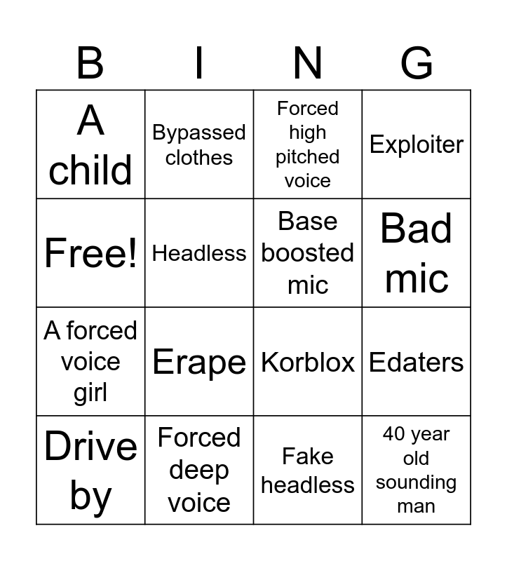 This bingo card has 16 words: Forced deep voice, Edaters, Forced high pitched voice, A child, A forced voice girl, Bypassed clothes, Korblox, Fake headless, Free!, Headless, Drive by, Exploiter, Erape, Bad mic, Base boosted mic and 40 year old sounding man.